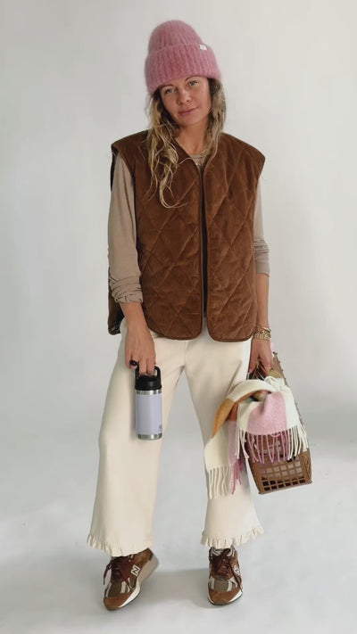 The Tahoe vest is our bestseller! Reversible: one side is cotton corduroy, the other side is a classic khaki check. It pairs perfectly with the Misha shirt and Fall pants, which are made of the same check fabric. The side seam pockets are only on the corduroy side.