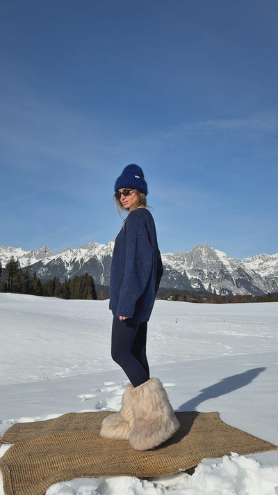 The Cloud Long is an elongated version of our iconic Cloud sweater. This chunky wool sweater is knitted in Poland. The yarn, imported from Italy, features beautiful navy blue stitches. The relaxed fit flatters any figure, and the sweater is exceptionally warm and soft to the touch.